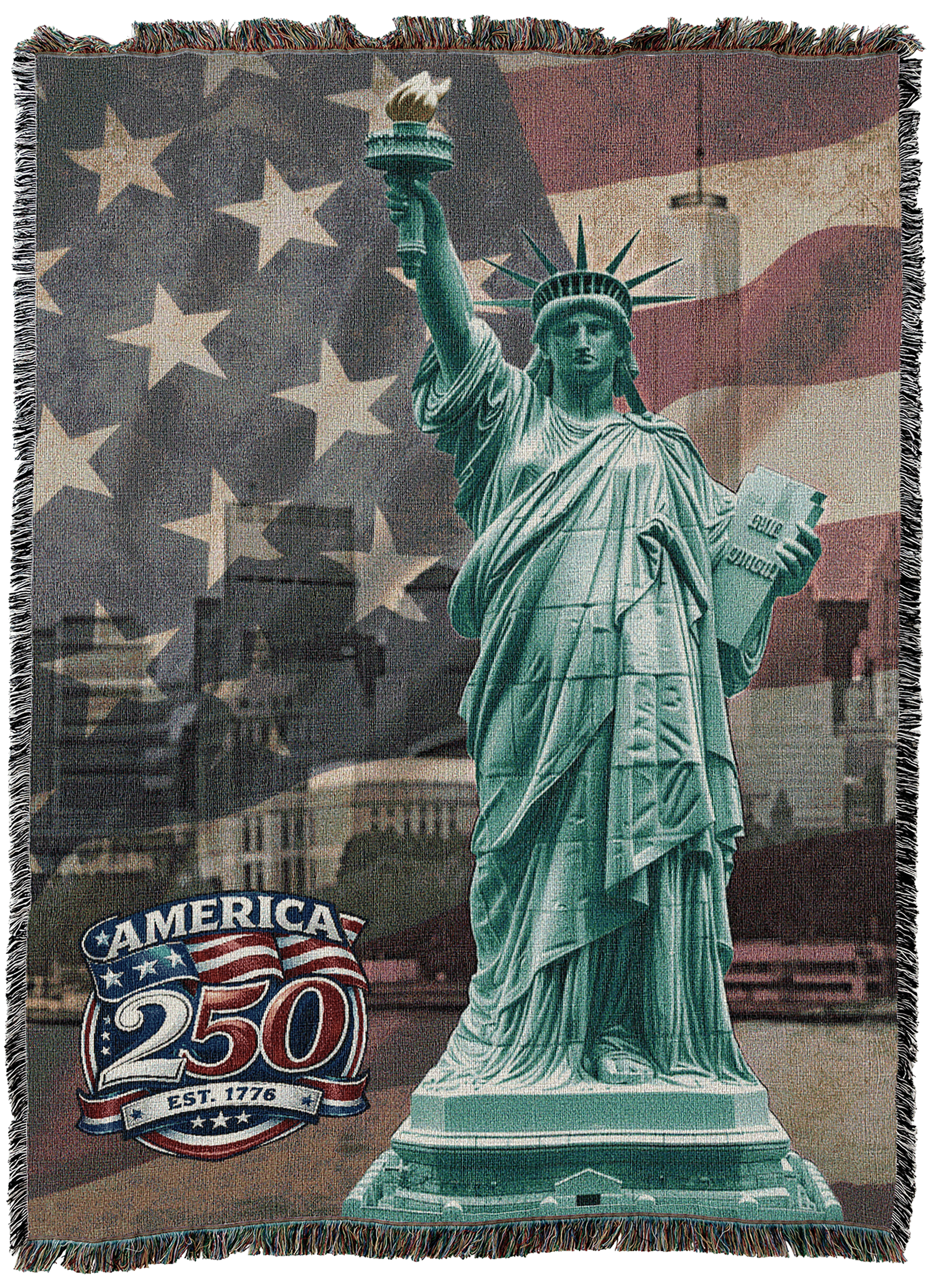 Introducing the America 250 Collection of uniquely crafted, USA-made blanket woven into the very fabric of American style. Experience comfort, artistic freedom, with this premium, jacquard-woven masterpiece. Unlike surface prints, our blankets feature photographic-quality images woven directly into the fabric using a blend of recycled and new cotton yarn, ensuring lasting softness that improves with every wash. This tapestry-quality piece transitions seamlessly from wall art to a luxurious throw, making it a truly memorable promotional award or personal gift. Our top-selling 54″ x 72″ size boasts 8 miles of woven cotton thread in 147 colors, providing a limitless design palette for your brand to stand out from the crowd. Create an heirloom keepsake that embodies American comfort.